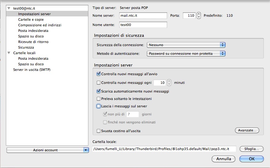 NB: Questa configurazione rende più probabile la saturazione della casella, visto che la posta rimane sul server per più giorni. Pertanto è decisamente sconsigliata se ricevete abitualmente messaggi con allegati molto grandi (file grafici, foto e simili). In ogni caso si consiglia di non eccedere mai il valore di 5 o 7 giorni per la conservazione della posta sul server.